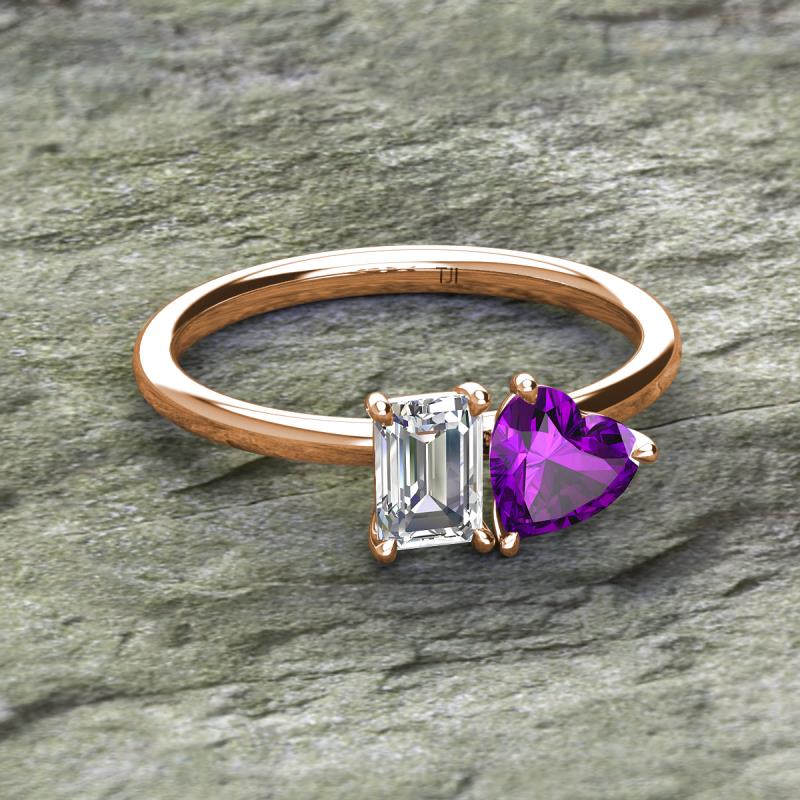 Simple and beautiful, this enchanting 2 Stone Duo Ring flaunting an Emerald Shape Forever One Moissanite dazzling along with Heart Shape Amethyst are perfect for the women who have a modern outlook and are willing to be unique.