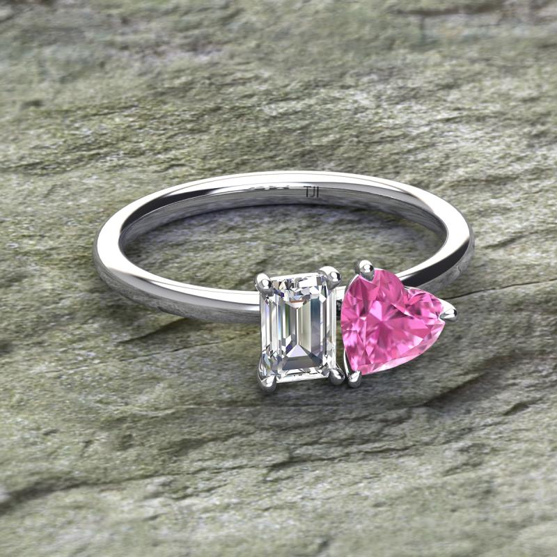 Emerald Shape Forever One Moissanite & Heart Shape Pink Sapphire 1.90 ctw Four Prong Womens 2 Stone Duo Engagement Ring Platinum More Details ...