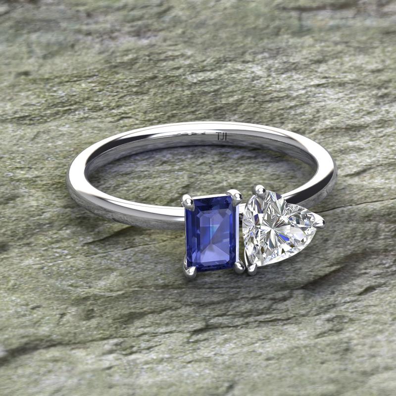 Simple and beautiful, this enchanting 2 Stone Duo Ring flaunting an Emerald Shape Iolite dazzling along with Heart Shape Forever Brilliant Moissanite are perfect for the women who have a modern outlook and are willing to be unique.