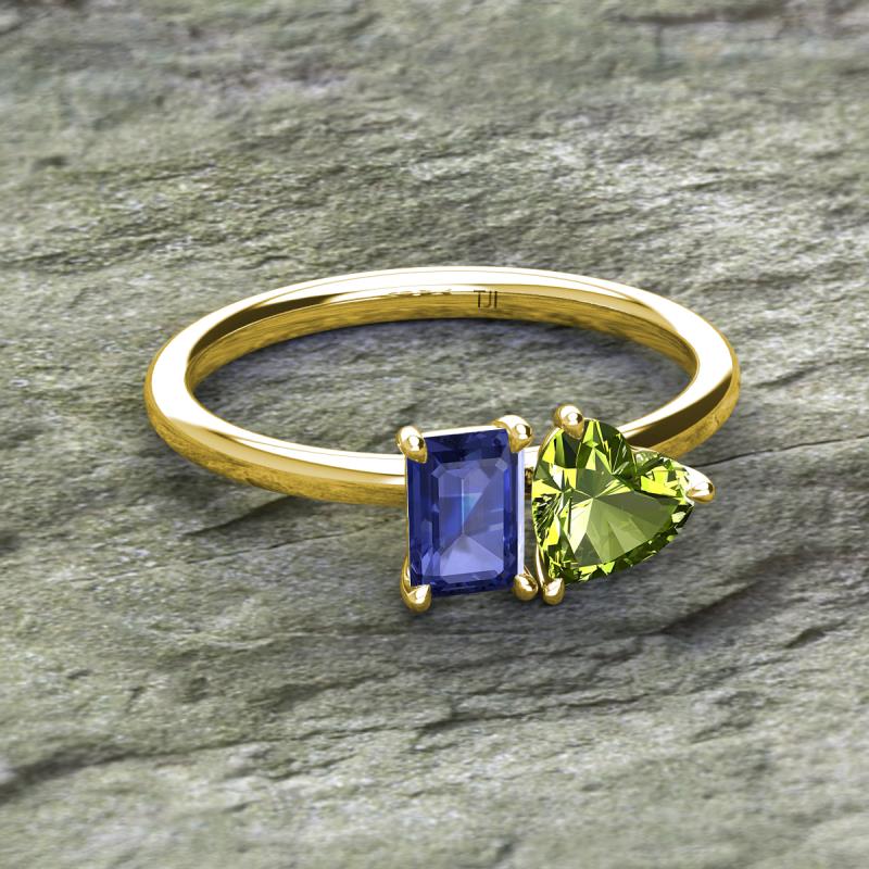 Simple and beautiful, this enchanting 2 Stone Duo Ring flaunting an Emerald Shape Iolite dazzling along with Heart Shape Peridot are perfect for the women who have a modern outlook and are willing to be unique.