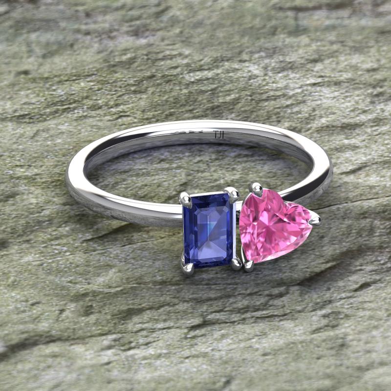 Simple and beautiful, this enchanting 2 Stone Duo Ring flaunting an Emerald Shape Iolite dazzling along with Heart Shape Pink Sapphire are perfect for the women who have a modern outlook and are willing to be unique.