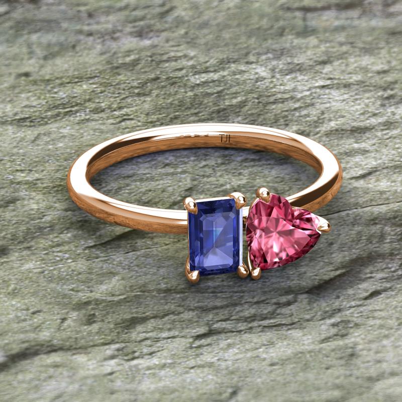 Simple and beautiful, this enchanting 2 Stone Duo Ring flaunting an Emerald Shape Iolite dazzling along with Heart Shape Pink Tourmaline are perfect for the women who have a modern outlook and are willing to be unique.