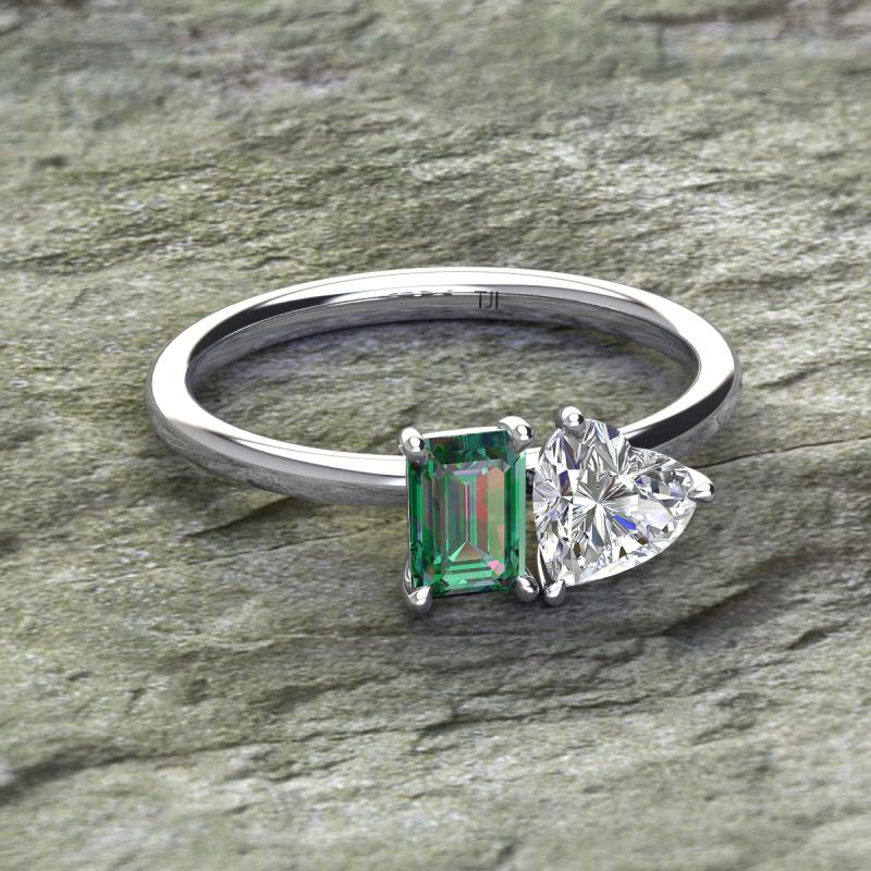 Simple and beautiful, this enchanting 2 Stone Duo Ring flaunting an Emerald Shape Lab Created Alexandrite dazzling along with Heart Shape Forever One Moissanite are perfect for the women who have a modern outlook and are willing to be unique.