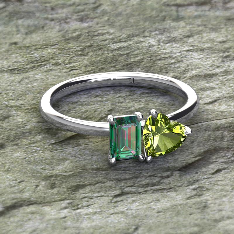 Simple and beautiful, this enchanting 2 Stone Duo Ring flaunting an Emerald Shape Lab Created Alexandrite dazzling along with Heart Shape Peridot are perfect for the women who have a modern outlook and are willing to be unique.