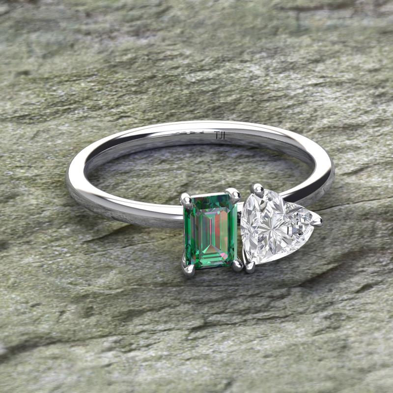 Simple and beautiful, this enchanting 2 Stone Duo Ring flaunting an Emerald Shape Lab Created Alexandrite dazzling along with Heart Shape White Sapphire are perfect for the women who have a modern outlook and are willing to be unique.