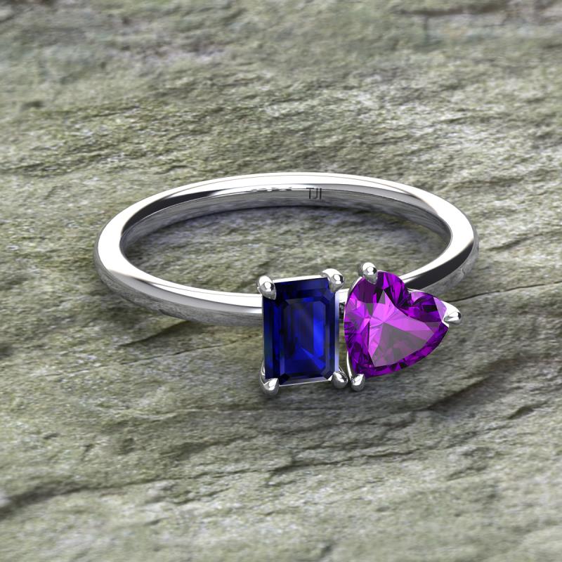 Simple and beautiful, this enchanting 2 Stone Duo Ring flaunting an Emerald Shape Lab Created Blue Sapphire dazzling along with Heart Shape Amethyst are perfect for the women who have a modern outlook and are willing to be unique.