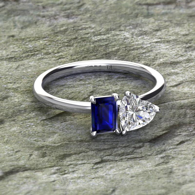 Simple and beautiful, this enchanting 2 Stone Duo Ring flaunting an Emerald Shape Lab Created Blue Sapphire dazzling along with Heart Shape Forever Brilliant Moissanite are perfect for the women who have a modern outlook and are willing to be unique.