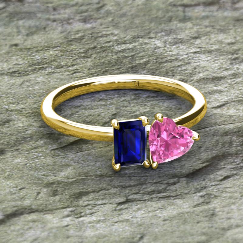 Simple and beautiful, this enchanting 2 Stone Duo Ring flaunting an Emerald Shape Lab Created Blue Sapphire dazzling along with Heart Shape Lab Created Pink Sapphire are perfect for the women who have a modern outlook and are willing to be unique.