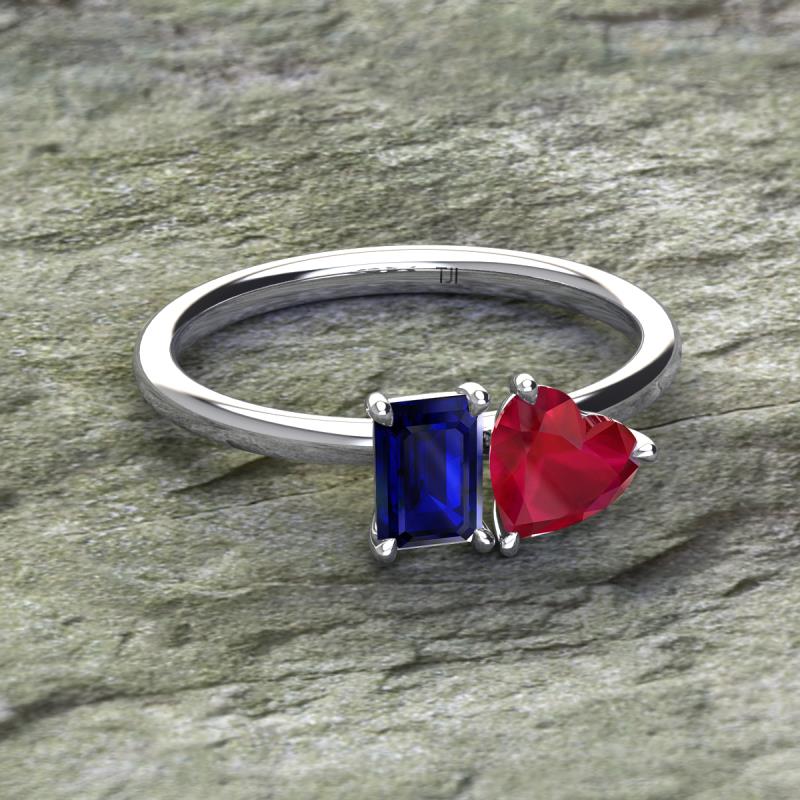 Simple and beautiful, this enchanting 2 Stone Duo Ring flaunting an Emerald Shape Lab Created Blue Sapphire dazzling along with Heart Shape Lab Created Ruby are perfect for the women who have a modern outlook and are willing to be unique.