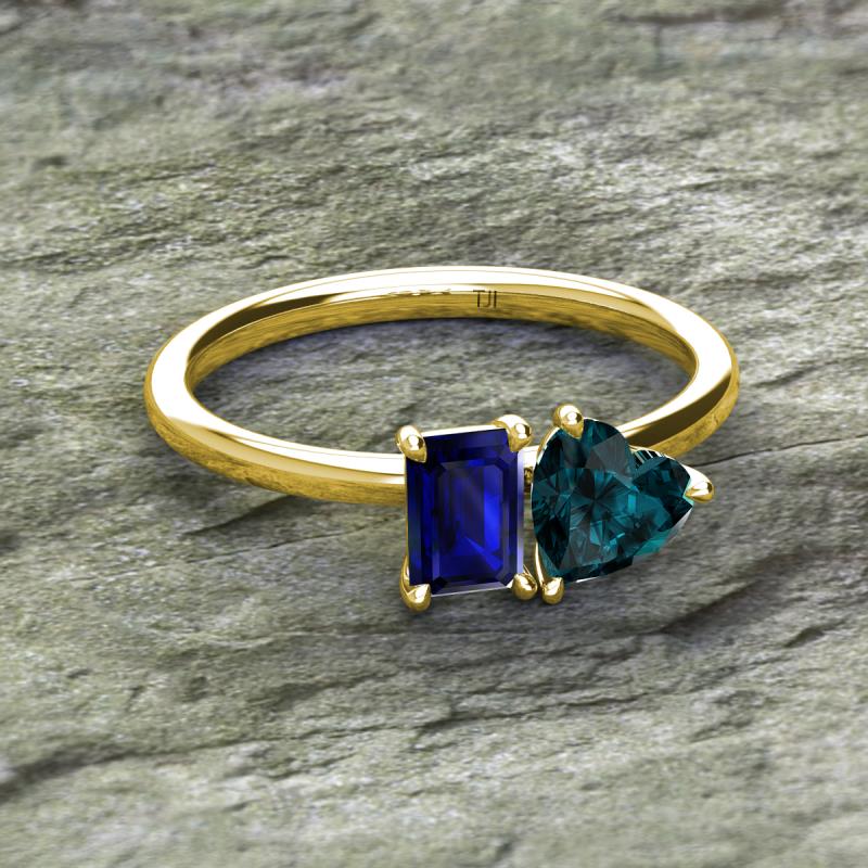 Simple and beautiful, this enchanting 2 Stone Duo Ring flaunting an Emerald Shape Lab Created Blue Sapphire dazzling along with Heart Shape London Blue Topaz are perfect for the women who have a modern outlook and are willing to be unique.