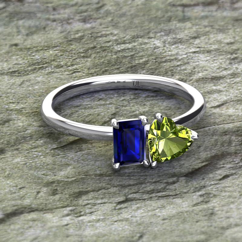 Simple and beautiful, this enchanting 2 Stone Duo Ring flaunting an Emerald Shape Lab Created Blue Sapphire dazzling along with Heart Shape Peridot are perfect for the women who have a modern outlook and are willing to be unique.