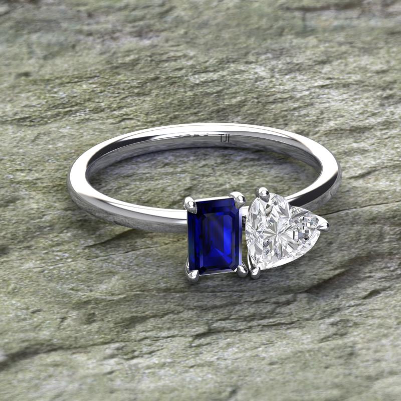 Simple and beautiful, this enchanting 2 Stone Duo Ring flaunting an Emerald Shape Lab Created Blue Sapphire dazzling along with Heart Shape White Sapphire are perfect for the women who have a modern outlook and are willing to be unique.