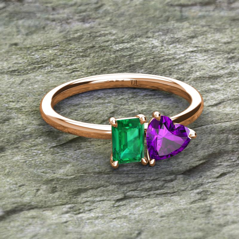 Simple and beautiful, this enchanting 2 Stone Duo Ring flaunting an Emerald Shape Lab Created Emerald dazzling along with Heart Shape Amethyst are perfect for the women who have a modern outlook and are willing to be unique.