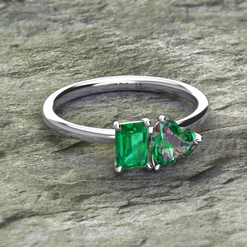 Simple and beautiful, this enchanting 2 Stone Duo Ring flaunting an Emerald Shape Lab Created Emerald dazzling along with Heart Shape Lab Created Alexandrite are perfect for the women who have a modern outlook and are willing to be unique.