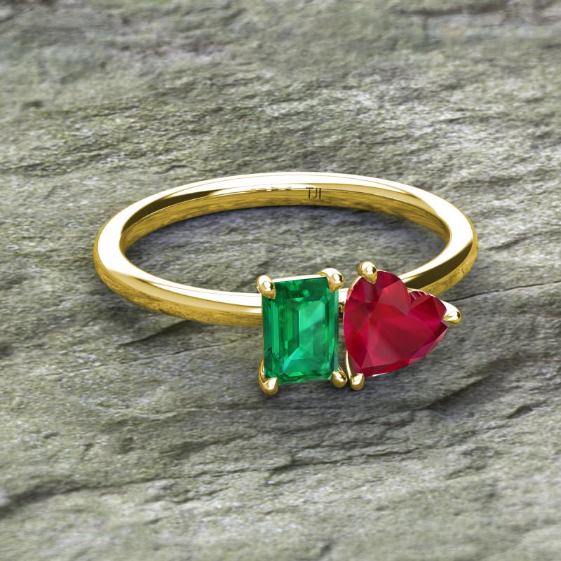 Simple and beautiful, this enchanting 2 Stone Duo Ring flaunting an Emerald Shape Lab Created Emerald dazzling along with Heart Shape Lab Created Ruby are perfect for the women who have a modern outlook and are willing to be unique.