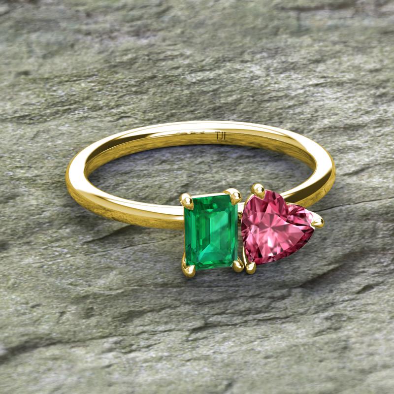 Simple and beautiful, this enchanting 2 Stone Duo Ring flaunting an Emerald Shape Lab Created Emerald dazzling along with Heart Shape Pink Tourmaline are perfect for the women who have a modern outlook and are willing to be unique.