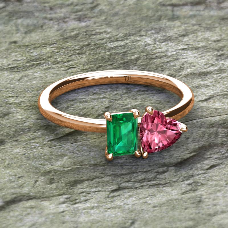 Simple and beautiful, this enchanting 2 Stone Duo Ring flaunting an Emerald Shape Lab Created Emerald dazzling along with Heart Shape Pink Tourmaline are perfect for the women who have a modern outlook and are willing to be unique.