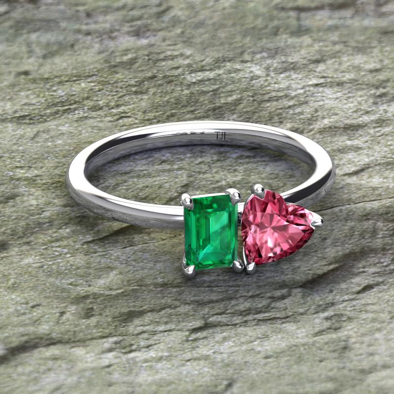 Simple and beautiful, this enchanting 2 Stone Duo Ring flaunting an Emerald Shape Lab Created Emerald dazzling along with Heart Shape Pink Tourmaline are perfect for the women who have a modern outlook and are willing to be unique.
