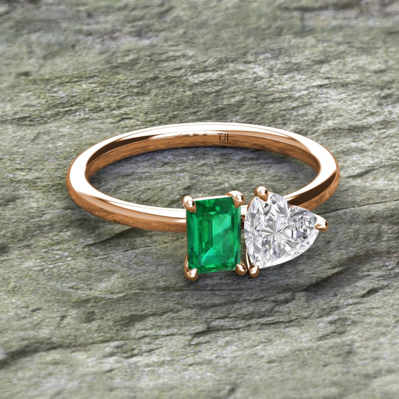 Simple and beautiful, this enchanting 2 Stone Duo Ring flaunting an Emerald Shape Lab Created Emerald dazzling along with Heart Shape White Sapphire are perfect for the women who have a modern outlook and are willing to be unique.