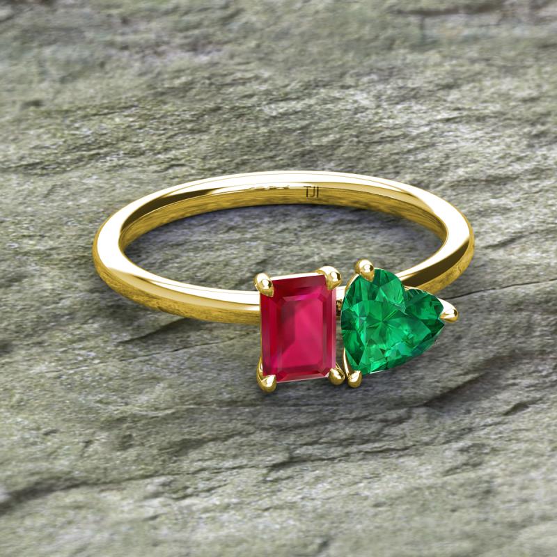 Simple and beautiful, this enchanting 2 Stone Duo Ring flaunting an Emerald Shape Lab Created Ruby dazzling along with Heart Shape Lab Created Emerald are perfect for the women who have a modern outlook and are willing to be unique.