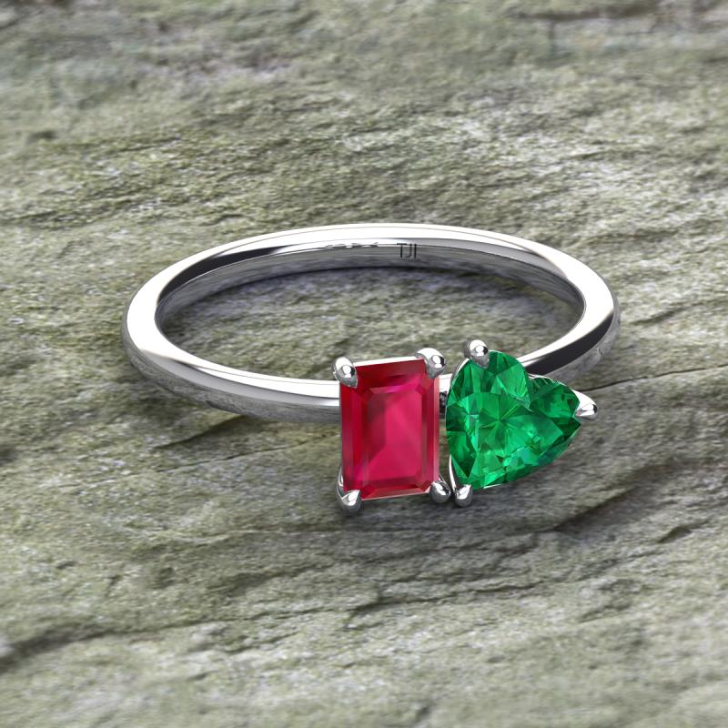 Simple and beautiful, this enchanting 2 Stone Duo Ring flaunting an Emerald Shape Lab Created Ruby dazzling along with Heart Shape Lab Created Emerald are perfect for the women who have a modern outlook and are willing to be unique.
