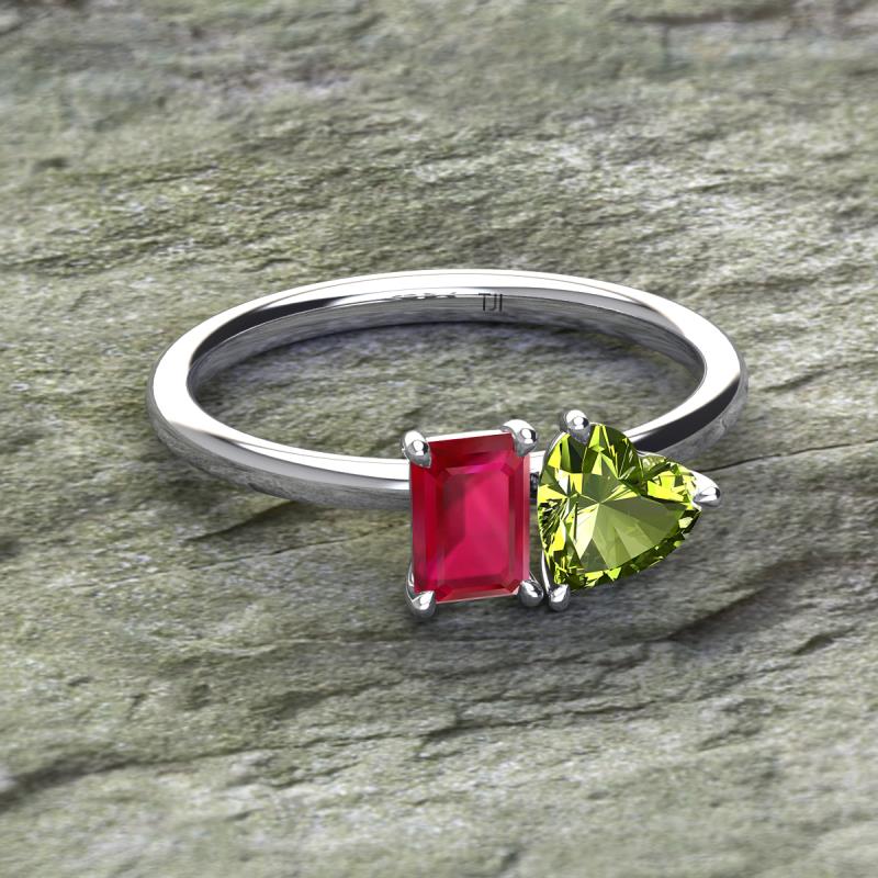 Simple and beautiful, this enchanting 2 Stone Duo Ring flaunting an Emerald Shape Lab Created Ruby dazzling along with Heart Shape Peridot are perfect for the women who have a modern outlook and are willing to be unique.
