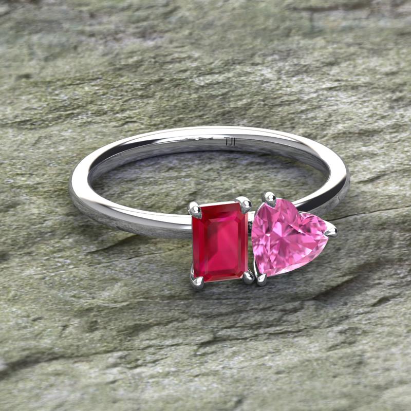 Simple and beautiful, this enchanting 2 Stone Duo Ring flaunting an Emerald Shape Lab Created Ruby dazzling along with Heart Shape Pink Sapphire are perfect for the women who have a modern outlook and are willing to be unique.
