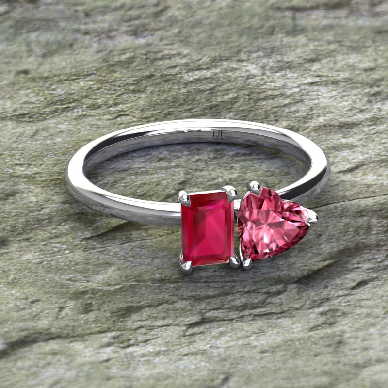 Simple and beautiful, this enchanting 2 Stone Duo Ring flaunting an Emerald Shape Lab Created Ruby dazzling along with Heart Shape Pink Tourmaline are perfect for the women who have a modern outlook and are willing to be unique.