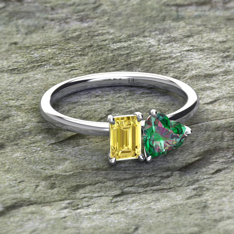 Simple and beautiful, this enchanting 2 Stone Duo Ring flaunting an Emerald Shape Lab Created Yellow Sapphire dazzling along with Heart Shape Lab Created Alexandrite are perfect for the women who have a modern outlook and are willing to be unique.