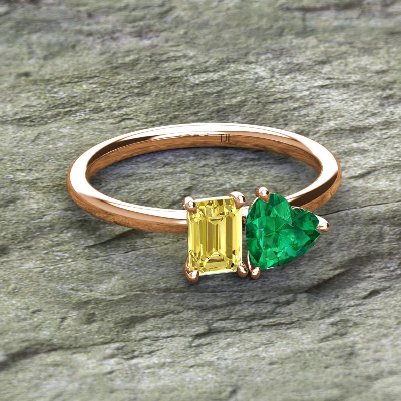 Simple and beautiful, this enchanting 2 Stone Duo Ring flaunting an Emerald Shape Lab Created Yellow Sapphire dazzling along with Heart Shape Lab Created Emerald are perfect for the women who have a modern outlook and are willing to be unique.