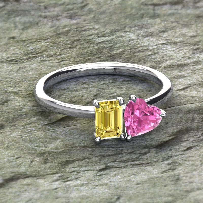Simple and beautiful, this enchanting 2 Stone Duo Ring flaunting an Emerald Shape Lab Created Yellow Sapphire dazzling along with Heart Shape Lab Created Pink Sapphire are perfect for the women who have a modern outlook and are willing to be unique.
