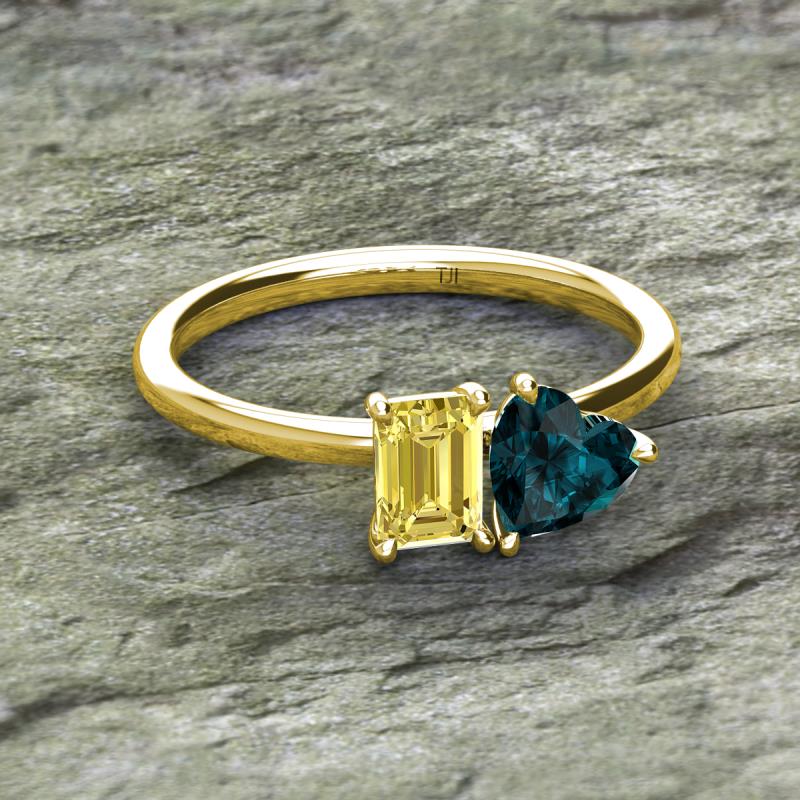 Simple and beautiful, this enchanting 2 Stone Duo Ring flaunting an Emerald Shape Lab Created Yellow Sapphire dazzling along with Heart Shape London Blue Topaz are perfect for the women who have a modern outlook and are willing to be unique.