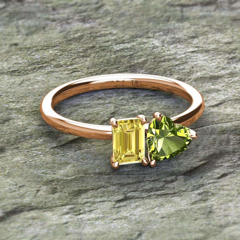 Simple and beautiful, this enchanting 2 Stone Duo Ring flaunting an Emerald Shape Lab Created Yellow Sapphire dazzling along with Heart Shape Peridot are perfect for the women who have a modern outlook and are willing to be unique.