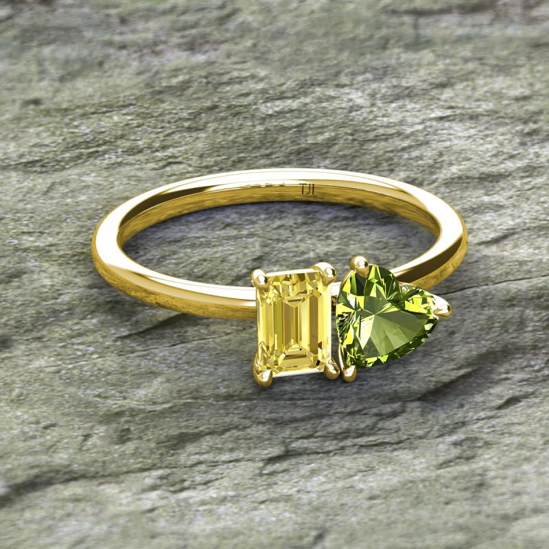 Simple and beautiful, this enchanting 2 Stone Duo Ring flaunting an Emerald Shape Lab Created Yellow Sapphire dazzling along with Heart Shape Peridot are perfect for the women who have a modern outlook and are willing to be unique.
