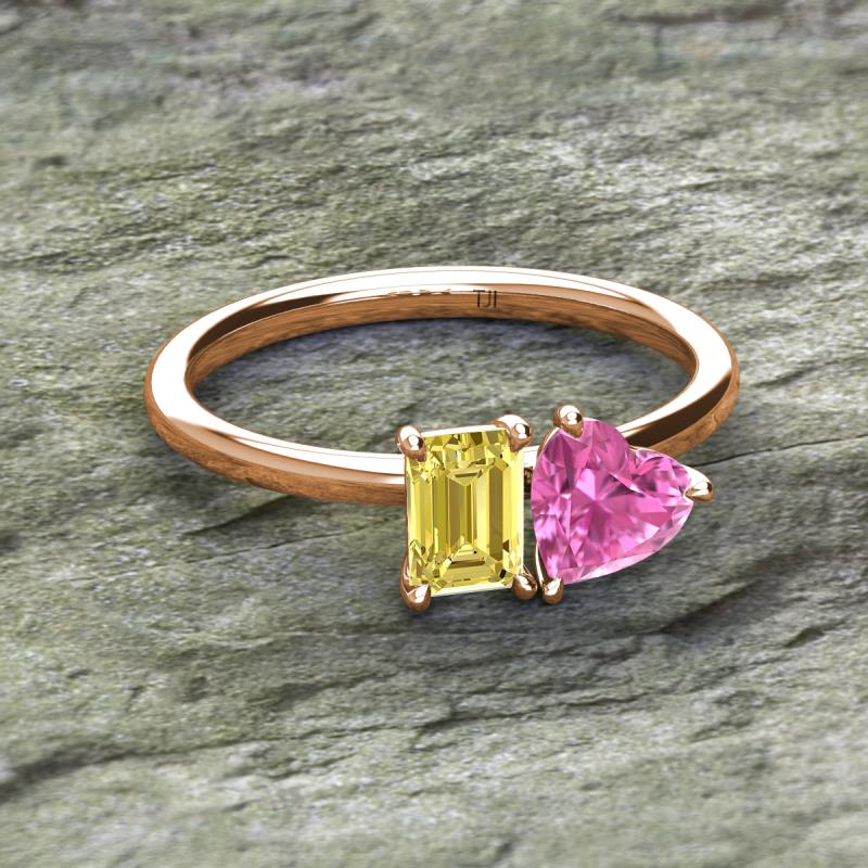 Simple and beautiful, this enchanting 2 Stone Duo Ring flaunting an Emerald Shape Lab Created Yellow Sapphire dazzling along with Heart Shape Pink Sapphire are perfect for the women who have a modern outlook and are willing to be unique.
