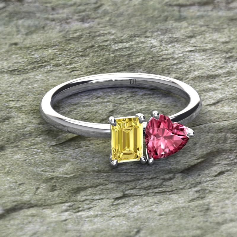 Simple and beautiful, this enchanting 2 Stone Duo Ring flaunting an Emerald Shape Lab Created Yellow Sapphire dazzling along with Heart Shape Pink Tourmaline are perfect for the women who have a modern outlook and are willing to be unique.