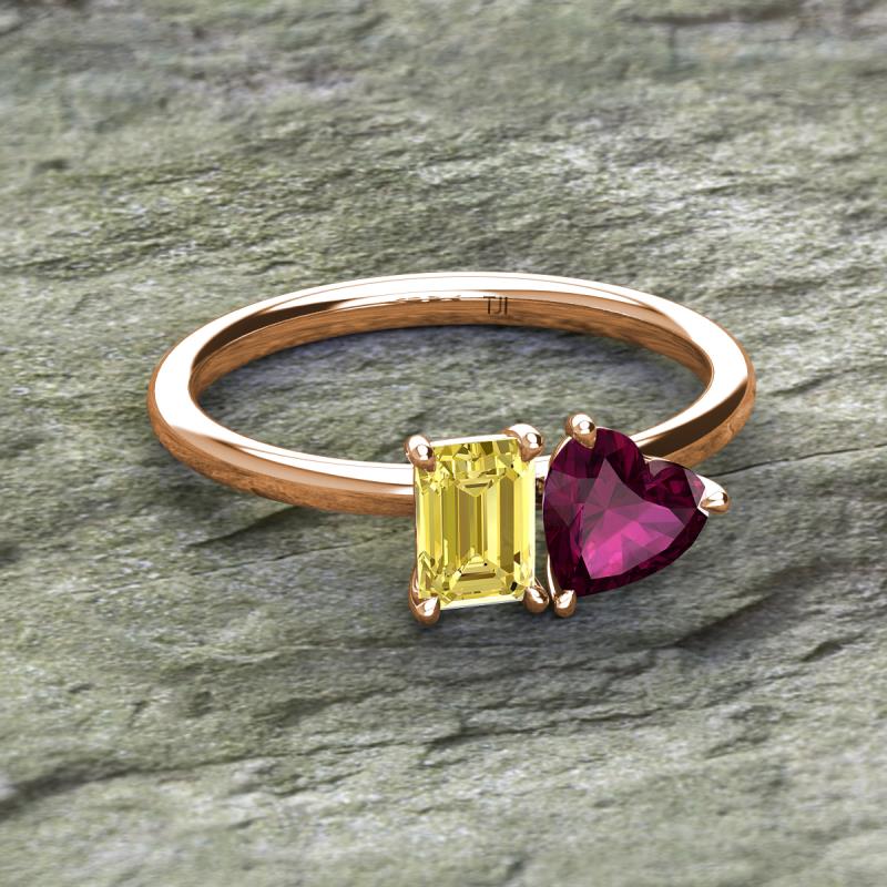 Simple and beautiful, this enchanting 2 Stone Duo Ring flaunting an Emerald Shape Lab Created Yellow Sapphire dazzling along with Heart Shape Rhodolite Garnet are perfect for the women who have a modern outlook and are willing to be unique.