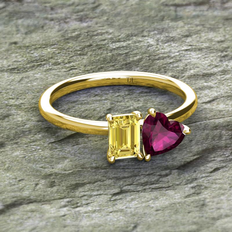 Simple and beautiful, this enchanting 2 Stone Duo Ring flaunting an Emerald Shape Lab Created Yellow Sapphire dazzling along with Heart Shape Rhodolite Garnet are perfect for the women who have a modern outlook and are willing to be unique.