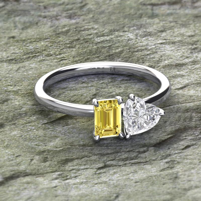 Simple and beautiful, this enchanting 2 Stone Duo Ring flaunting an Emerald Shape Lab Created Yellow Sapphire dazzling along with Heart Shape White Sapphire are perfect for the women who have a modern outlook and are willing to be unique.