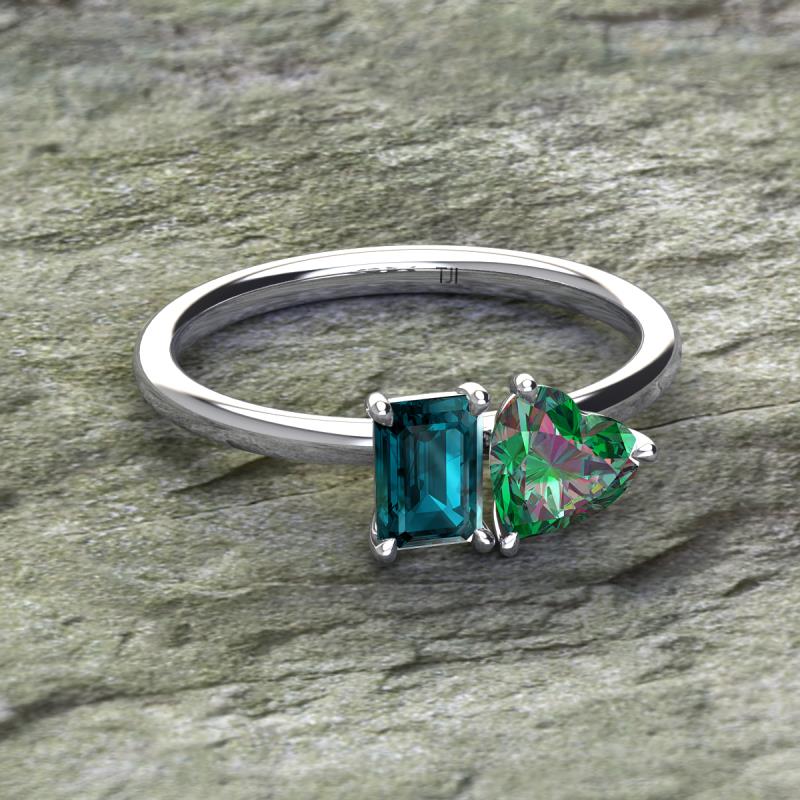 Simple and beautiful, this enchanting 2 Stone Duo Ring flaunting an Emerald Shape London Blue Topaz dazzling along with Heart Shape Lab Created Alexandrite are perfect for the women who have a modern outlook and are willing to be unique.