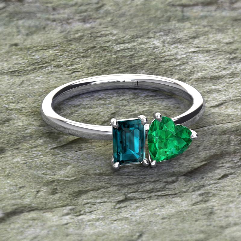 Simple and beautiful, this enchanting 2 Stone Duo Ring flaunting an Emerald Shape London Blue Topaz dazzling along with Heart Shape Lab Created Emerald are perfect for the women who have a modern outlook and are willing to be unique.