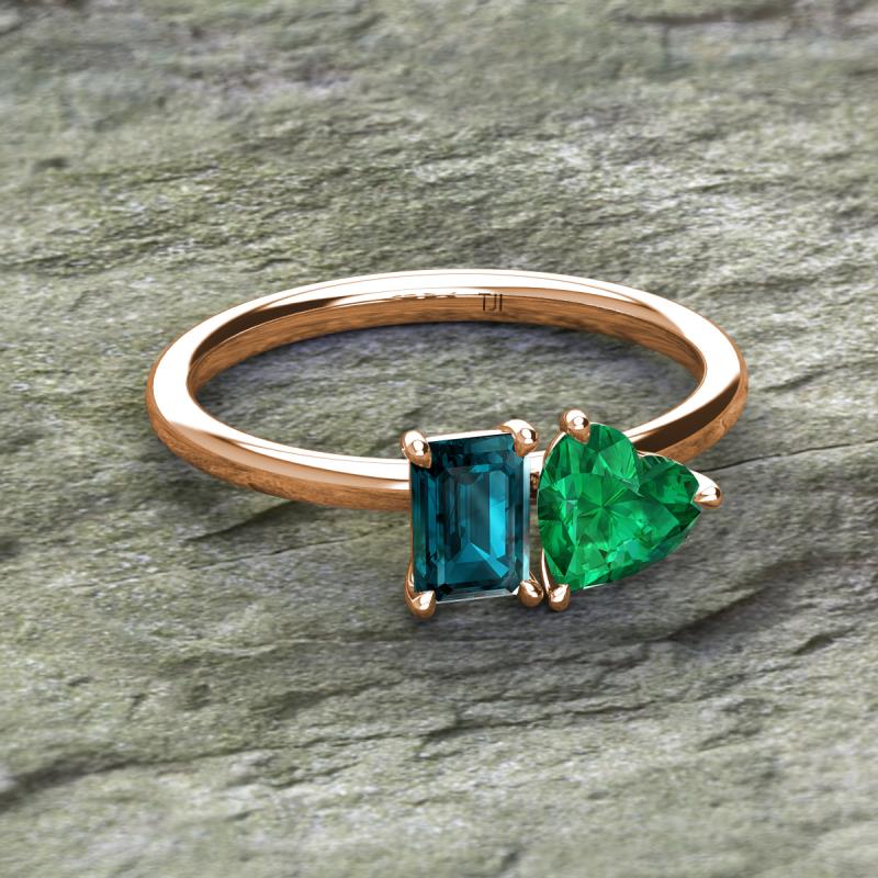 Simple and beautiful, this enchanting 2 Stone Duo Ring flaunting an Emerald Shape London Blue Topaz dazzling along with Heart Shape Lab Created Emerald are perfect for the women who have a modern outlook and are willing to be unique.