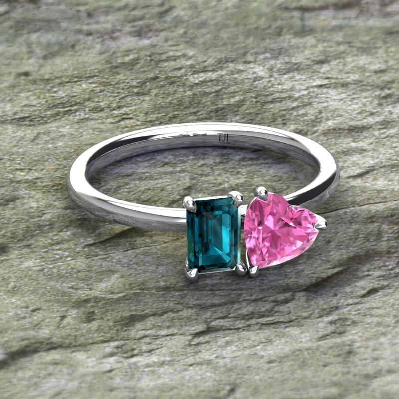 Simple and beautiful, this enchanting 2 Stone Duo Ring flaunting an Emerald Shape London Blue Topaz dazzling along with Heart Shape Lab Created Pink Sapphire are perfect for the women who have a modern outlook and are willing to be unique.