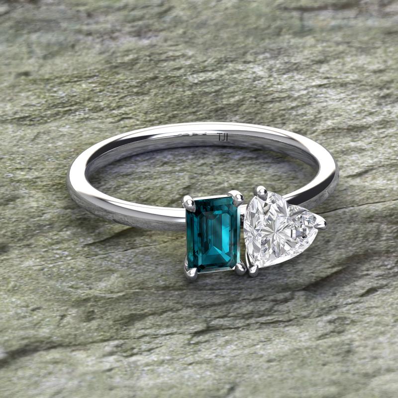 Simple and beautiful, this enchanting 2 Stone Duo Ring flaunting an Emerald Shape London Blue Topaz dazzling along with Heart Shape White Sapphire are perfect for the women who have a modern outlook and are willing to be unique.