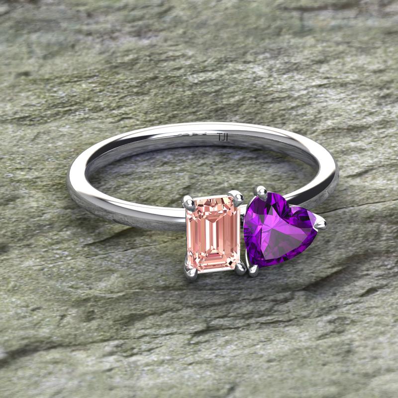 Simple and beautiful, this enchanting 2 Stone Duo Ring flaunting an Emerald Shape Morganite dazzling along with Heart Shape Amethyst are perfect for the women who have a modern outlook and are willing to be unique.