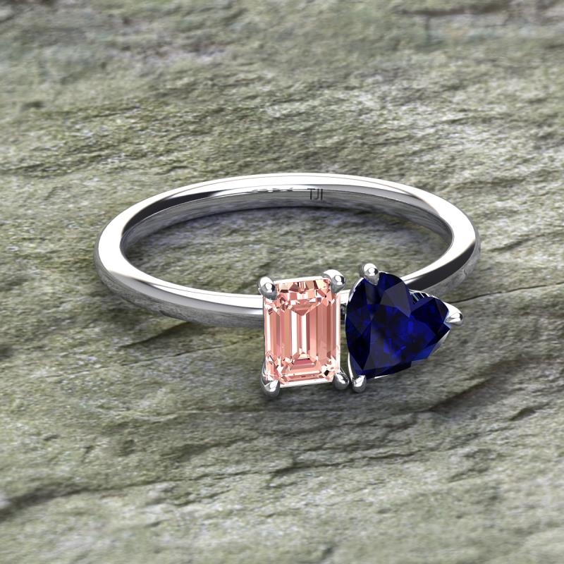 Simple and beautiful, this enchanting 2 Stone Duo Ring flaunting an Emerald Shape Morganite dazzling along with Heart Shape Lab Created Blue Sapphire are perfect for the women who have a modern outlook and are willing to be unique.