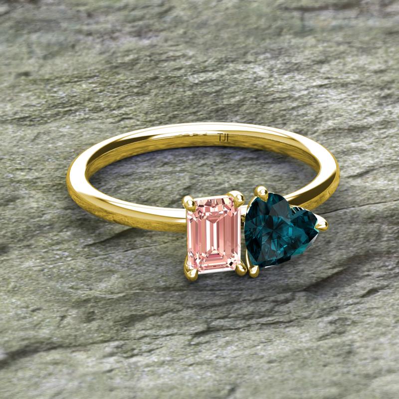Simple and beautiful, this enchanting 2 Stone Duo Ring flaunting an Emerald Shape Morganite dazzling along with Heart Shape London Blue Topaz are perfect for the women who have a modern outlook and are willing to be unique.
