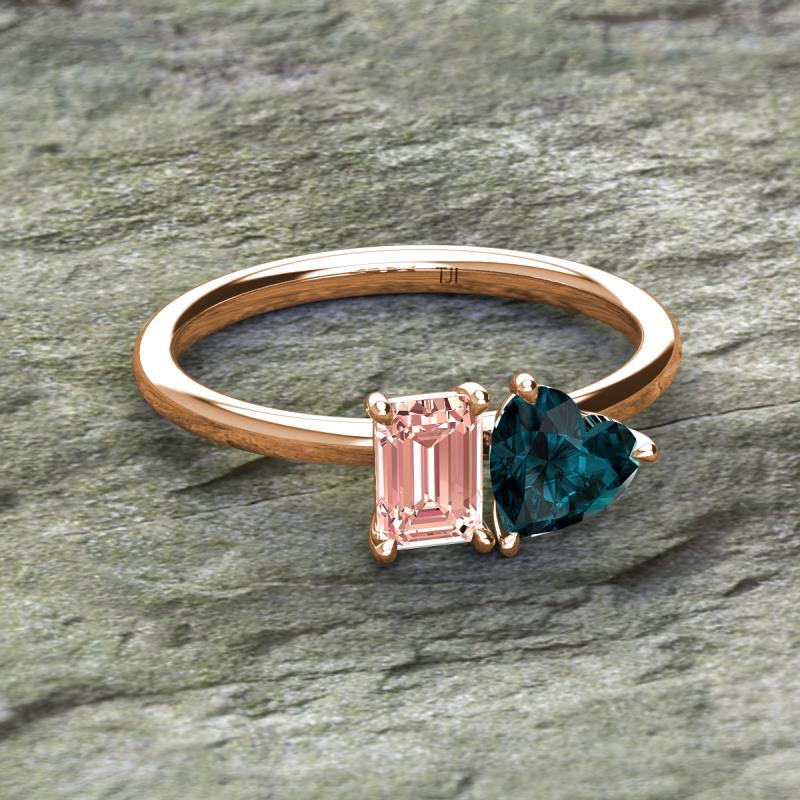 Simple and beautiful, this enchanting 2 Stone Duo Ring flaunting an Emerald Shape Morganite dazzling along with Heart Shape London Blue Topaz are perfect for the women who have a modern outlook and are willing to be unique.
