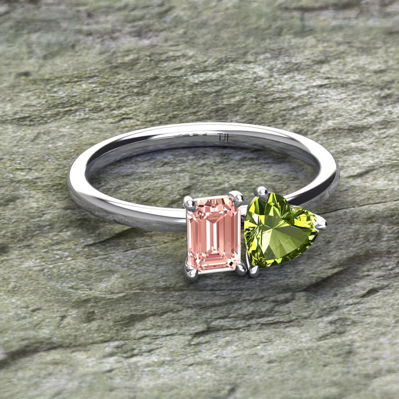 Simple and beautiful, this enchanting 2 Stone Duo Ring flaunting an Emerald Shape Morganite dazzling along with Heart Shape Peridot are perfect for the women who have a modern outlook and are willing to be unique.