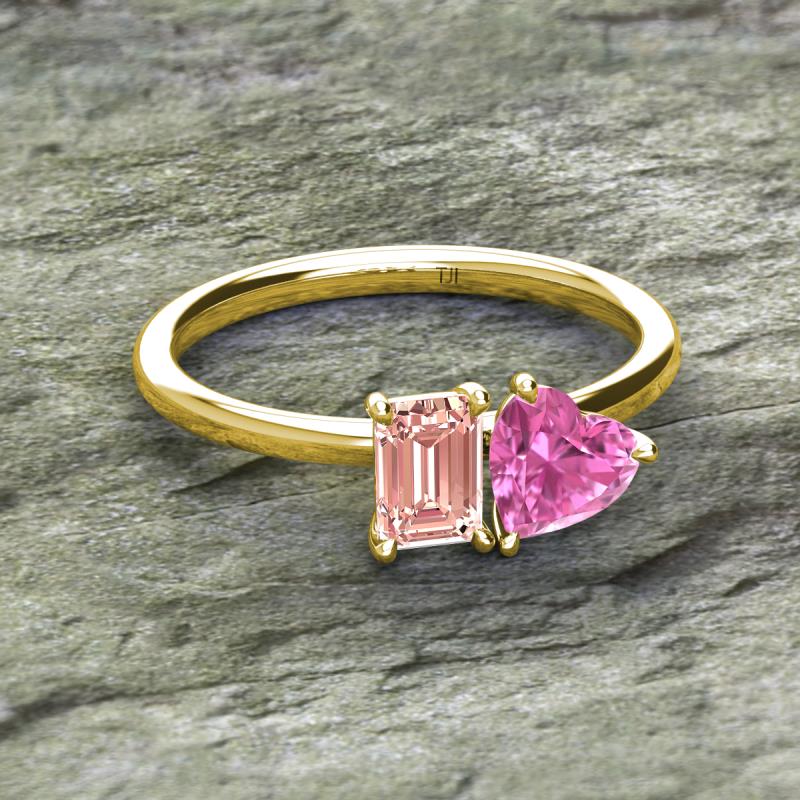 Simple and beautiful, this enchanting 2 Stone Duo Ring flaunting an Emerald Shape Morganite dazzling along with Heart Shape Pink Sapphire are perfect for the women who have a modern outlook and are willing to be unique.